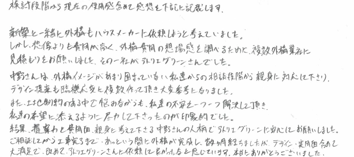 結果、提案力と費用面、親身に考えて下さる中野さんの人柄でアトリエグリーンに安心してお願いしました。